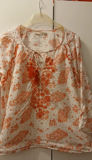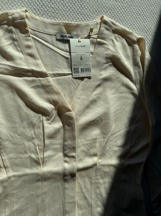 Blusa blanca de tejido fluido con abotonadura delantera y manga 3/4. Usada una vez. Sirve tanto para talla M como S.
