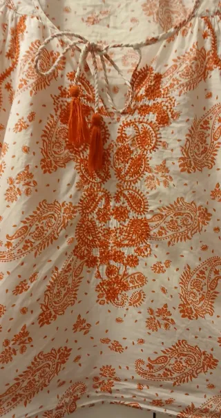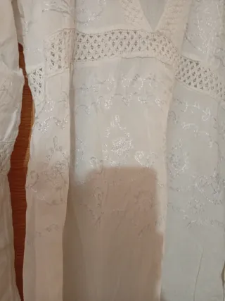 Preciosa blusa o vestido estilo ibicenco, ideal para lucir un look fresco y bohemio. Talla M - Diseño con bordados detallados. - Mangas acampanadas con detalles calados. - Escote en V pronunciado. - Adornos de encaje en puños y bajo Ropa mujer chica playa playero vestido.
