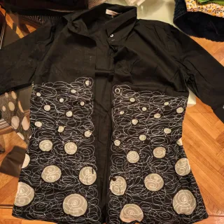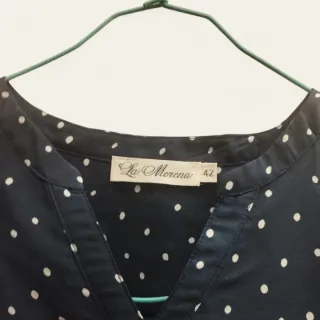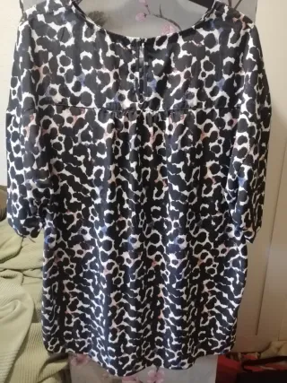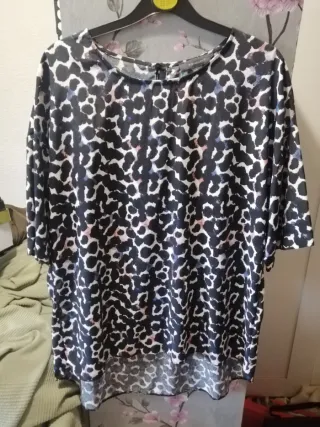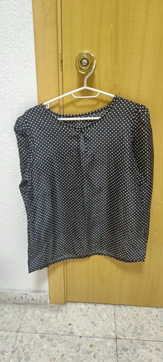 Camisa/blusa oversize azul marino con lunares blancos. Muy cómoda y fácil de combinar. De muy buena calidad, comprada en tienda local. El tejido es tipo gasa. Está nueva, nunca se llegó a estrenar. Talla 42 / XL, pero se puede usar para más tallas si quieres que sea más oversize. Medidas: Sisa a sisa: 50 cm Largo: 70 cm Envíos en el mismo día.