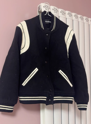 Chaqueta estilo varsity con un diseño clásico en negro y blanco. Perfecta para un look casual. - Cuerpo principal en color negro. - Mangas y detalles en color blanco. - Cuello y puños con rayas. - Cierre de botones a presión.