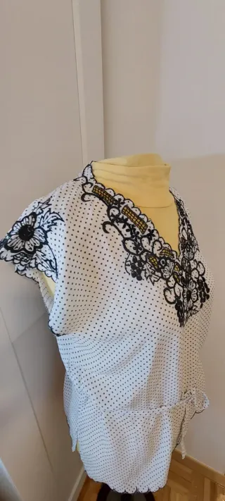 Blusa de gasa blanca con lunares y bordados en negro. Talla aproximada XL. Medidas: de sisa a sisa 53 centímetros; largo 64 centímetros. Usada, buen estado. #blusa #vintage #lunares #bordado
