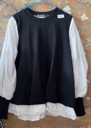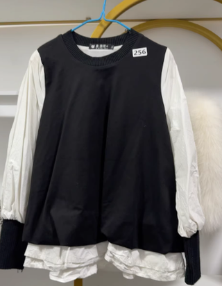 Prenda de vestir moderna con un diseño bicolor. - Mangas largas blancas. - Cuerpo principal negro. - Detalle de volantes en la parte inferior.