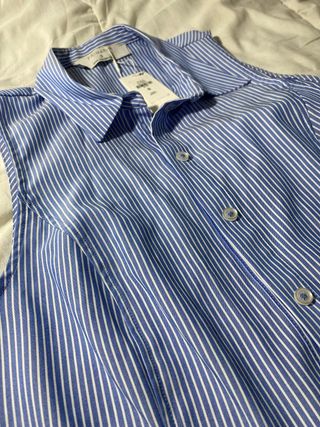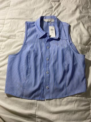 Blusa de rayas verticales en tonos azules y blancos. Diseño sin mangas y cuello camisero. - Cierre de botones. - Corte moderno.