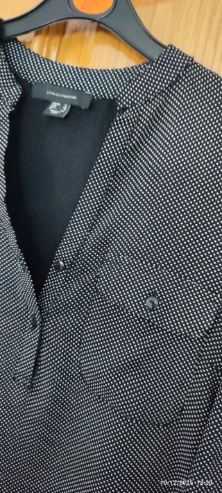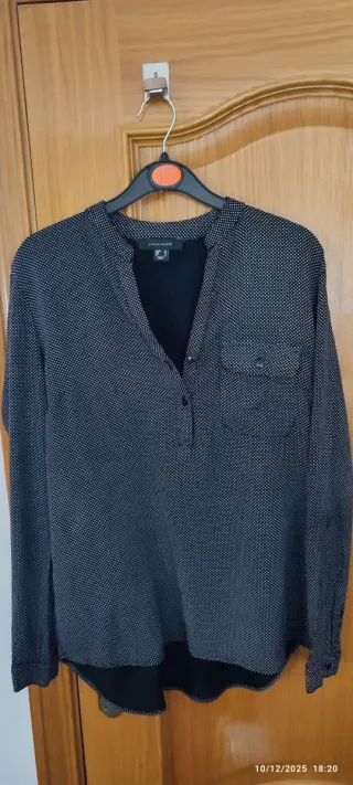 Elegante blusa de vestir con un estampado discreto, negra con puntitos blancos. - Diseño con cuello mao y dos botones. - Bolsillo en el pecho. - Manga larga. Está en muy buen estado. Talla 40. Tejido 100% viscosa.