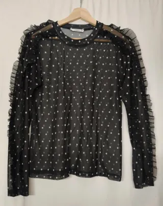Blusa transparente de Mango con un diseño de lunares y volantes. - Tejido de malla. - Estampado de lunares blancos. - Detalle de volantes en mangas y hombros.