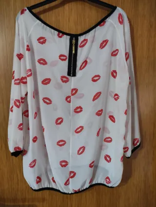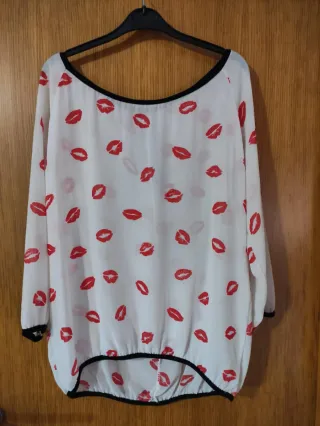 Blusa blanca con un divertido estampado de labios rojos por toda la prenda. Tiene un escote redondo y mangas largas. - Diseño de labios rojos. - Escote redondo. - Mangas largas. - Bajo elástico.