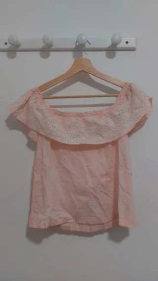 Bonita blusa de hombros descubiertos en tono rosa pastel. Presenta un diseño con volantes y detalles de encaje blanco. - Escote Bardot con detalle de encaje. - Mangas cortas con volante. - Tejido ligero y vaporoso.