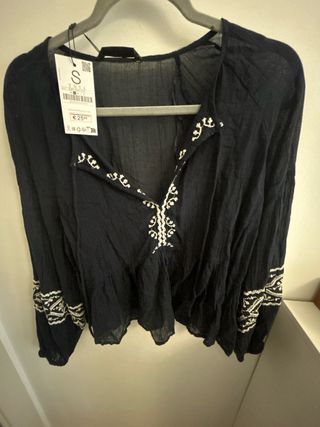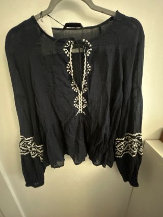 Preciosa blusa de Stradivarius con detalles bordados. - Diseño con escote en V y manga larga. - Bordados blancos decorativos en el pecho y puños. - Tejido ligero y vaporoso.
