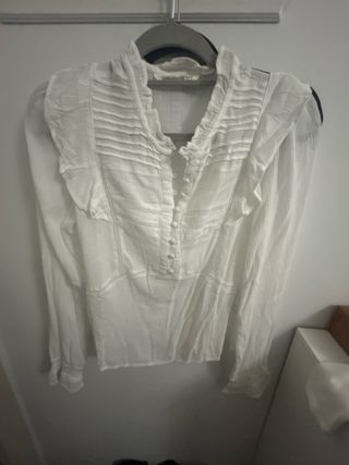 Bonita blusa blanca con un diseño moderno y favorecedor.manga farol. Es una XS pero viene perfecta hasta M - Mangas largas abullonadas con puños elásticos. - Cuello redondo. - Cierre de botones en la parte delantera. - Cintura elástica fruncida. - Detalle de volantes en la botonadura.