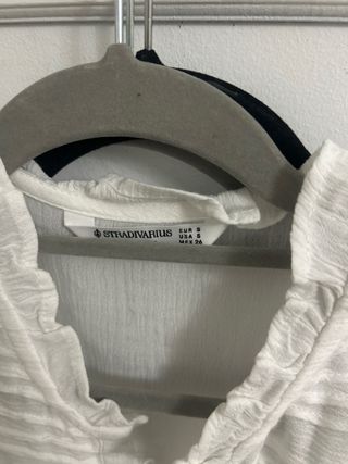 Elegante blusa de Stradivarius con un diseño delicado y detalles que la hacen única. - Cuello alto con volantes. - Mangas largas con puños. - Cierre de botones en la parte delantera. - Tejido ligero y vaporoso.