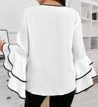 Elegante blusa blanca con mangas de volantes. - Diseño con volantes en las mangas. - Ribete negro en cuello y mangas.