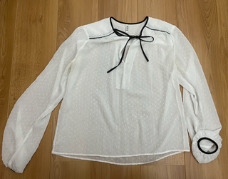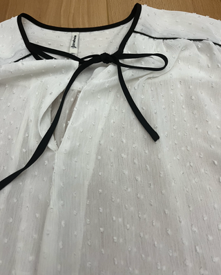 Elegante blusa blanca con un detalle de cordón negro en el cuello. - Diseño con puntos texturizados. - Mangas largas abullonadas. - Cuello con lazada. - Puños con elástico negro. - Prenda con varios usos, en buen estado. - Elegante y versátil, ideal para looks formales o para el día a día, fácil de combinar.