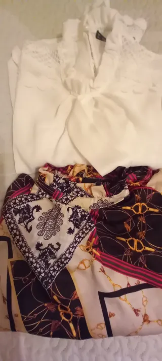 Dos blusas estilo romántico con encaje y bordados Pone talla 40, la sisa mide 48 cm - Una blusa con manga 3/4 con un pequeño volante y detalles de bordado y puntillas. - Otra blusa de manga larga con goma, detalle de encaje. - Ambas blusas tienen un corte holgado y son perfectas para un look casual o elegante. Un solo uso Descripción fotos Las 2 por 6€