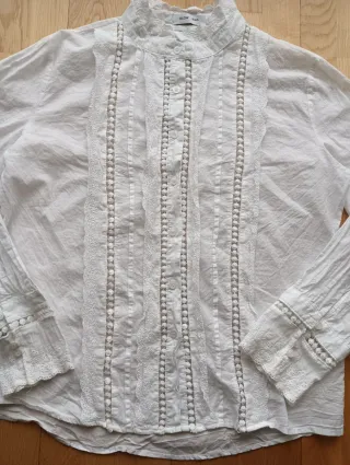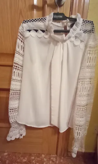Nuevo, pocos usos.Medidas fotos.Blusa de manga larga con detalles de encaje y volantes. Cuello alto con cierre de botones.Puños con aberturas y botones.Adornos de encaje y pompones en la parte delantera. Tejido algodón ligero y con textura. Artículos en liquidación sin devoluciones. Dudas o aclaraciones del producto preguntadme, gracias! Por si os interesa echar un vistazo en mi perfil tengo a la venta más cosas. #Ropanuevo#Accesorios#Bisuteria #Hogar#Juguetes#Calzado#regalos #Comonuevo#Buenestado #Nuevo #Limpio#Mujer#Hombre #Niño #electronica#Lotes#enviowallapop