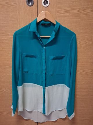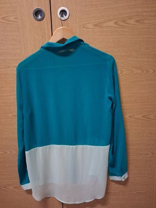 Elegante blusa con un diseño bicolor. - Parte superior en color turquesa - Parte inferior en color blanco. - Manga larga. - Cuello camisero. - Dos bolsillos en el pecho.