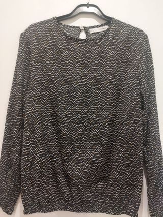 Elegante blusa con un diseño de topos blancos sobre fondo negro. Su tejido ligero la hace ideal para cualquier ocasión. - Diseño de lunares. - Manga larga.