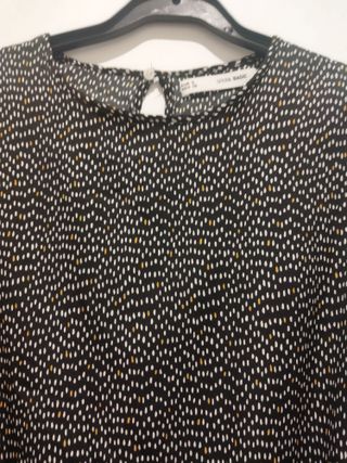 Blusa sin mangas con estampado de topos. - Cuello blanco Peter Pan. - Tejido ligero y fluido. - tiene un ligero roce en la parte de atrás, puesto no se nota prácticamente.