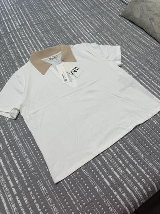 Blusa de manga corta con cuello tipo polo. Talla L - Cuello de canalé en color beige. - Abertura en V en el cuello.