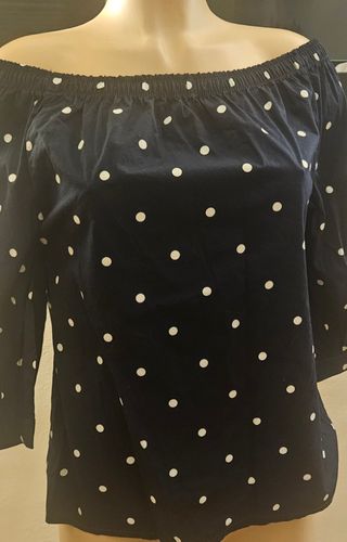Blusa con escote barco estampado de lunares en color azul marino como estampado de lunares en blanco camisa de media manga acabando ene lazada camisa muy versátil talla 36