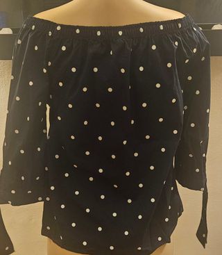 Blusa con un diseño de lunares clásico y moderno. Su corte de hombros descubiertos le da un toque coqueto. - Estampado de lunares blancos sobre fondo negro. - Mangas medias anchas. - Escote elástico fruncido.
