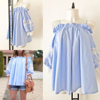 Blusa de rayas con encaje en el escote en forma de barco. - Con tirantes de la tela de la blusa para mantener la posición en los hombros. - Diseño de hombros semi-descubiertos. - Manga larga. - Tejido ligero y cómodo.