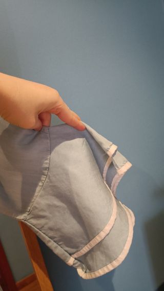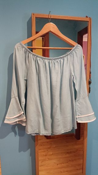 Blusa de mujer de color vaquero claro. Escote amplio. Lo puedes poner de barco o debajo de hombros. Mangas con dos volantes ribeteado en blanco. Usada pero en buen estado.