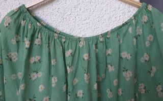 Preciosa blusa de color verde con estampado de margaritas. Es de manga tres cuartos y tiene un bonito escote. - Escote tipo barco - Mangas con elástico - Perfecta para la primavera o el verano. Tejido súper fresquito y muy cómodo. Talla L, en perfecto estado.