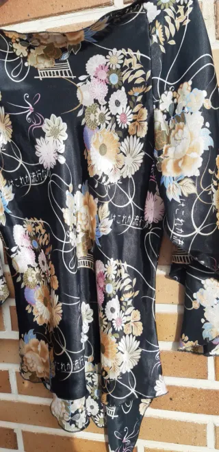 Blusa con un diseño oriental muy llamativo y original. Mide 48 cm entre axilas. - Estampado floral multicolor sobre fondo negro. - Mangas amplias abiertas y escote barco.