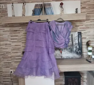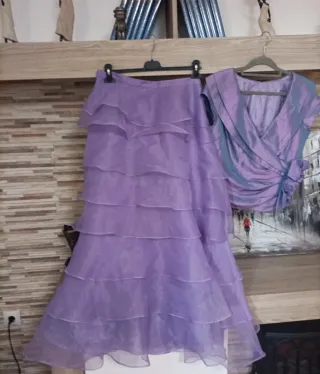 Conjunto de dos piezas elegante. Corpiño José Jimenez Orellana y falda DRSY - Falda larga con volantes. - Blusa con escote cruzado y detalle de flor.