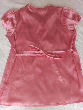 Blusón de seda de manga corta rosa chicle tipo lencero con jaretas de adorno en el escote y botones forrados. Detalle de botones también forrados en la manga y lanzada en la espalda lo que permite ajustarla al ancho deseado. Talla 42.