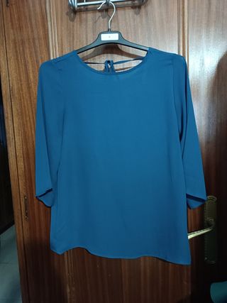 Blusa de Shana en tela muy fresca con gran escote en la espalda, cerrado con un pequeño lazo. Manga francesa suelta. En la foto se ve azul, pero es un verde oscuro azulado. Tiene la talla XS, pero es como para una S . Largo 64 y de sisa a sisa 45. En perfecto estado, poquísimo uso.