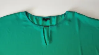 Elegante blusa de Massimo Dutti en un llamativo color verde esmeralda. Su diseño presenta detalles fruncidos en los hombros y un favorecedor escote en V, sin abotonadura. Ideal tanto para looks formales como outfits más casuales. Tejido satinado con caída.