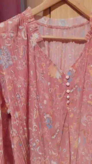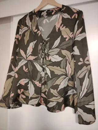 Blusa con estampado floral en tonos verdes y rosas. Escote en V con cordones decorativos. - Mangas largas ligeramente acampanadas y pequeña abertura lateral - Diseño con hojas y flores. Pocas puestas