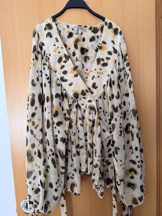 ✨ Diseño muy original con nudo delantero y anilla central, escote en V y mangas abullonadas que dan un aire romántico. 🌸 Es 100% poliéster, ligera y con mucha caída. 🔶️Talla: T/U (Talla Única) 🔶️Marca: Azalea 📦 Hago envíos. 🤝 Entrega en mano en Somosaguas (Madrid).