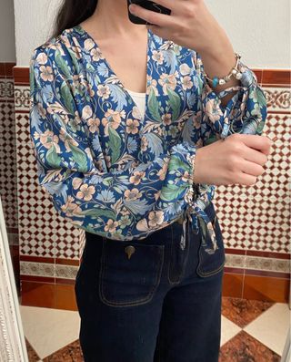 Blusa de Massimo Dutti con un bonito estampado floral. - Diseño con escote en V y cordones. - Mangas largas. - Estampado multicolor sobre fondo beige.
