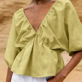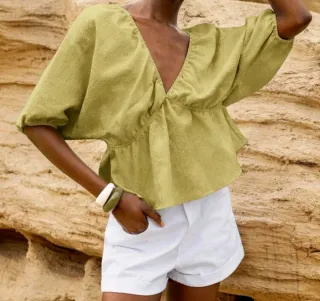 Elegante blusa de verano con un diseño moderno y favorecedor. Perfecta para cualquier ocasión. - Escote en V. - Mangas acampanadas. - Tejido ligero y fluido.
