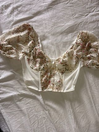 Bonita blusa con estampado floral y mangas abullonadas. - Diseño tipo corsé. - Escote en V. - Tejido ligero y vaporoso.