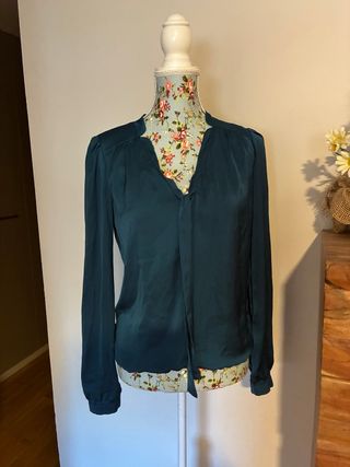 Elegante blusa con volantes, ideal para ocasiones especiales.Tela tipo raso . Puesta solo una vez Da para una 50/52 - Diseño con escote en V. - Tejido satinado con caída. - Mangas largas.