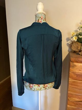 Elegante blusa de manga larga en color petróleo. Su diseño fluido y el escote le dan un toque sofisticado. - Tejido satinado. - Escote en V con lazada. - Mangas largas abullonadas en los hombros.