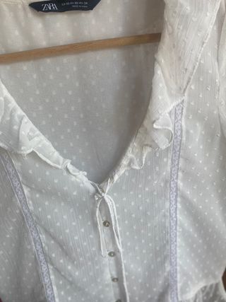 Bonita blusa de Zara con un diseño delicado y femenino. - Tejido blanco con textura de topos. - Detalles de volantes y encaje en el escote. - Cierre de botones en la parte delantera. - Cintura elástica fruncida.