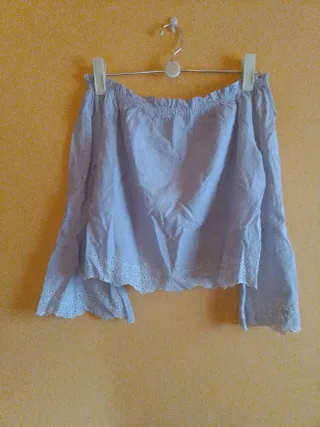 Blusa de manga larga con detalle de bordado. - Diseño con escote elástico, para poner por los hombros - Mangas acampanadas. - Bajo con calado bordado - Estampado de rayas finas. Sisa, 52 cm Largo ,42 cm