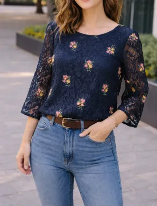 Elegante blusa de manga larga con detalles de encaje. - Diseño con escote redondo. - Mangas y bajo con aplicaciones de encaje floral. - Corte holgado y cómodo.
