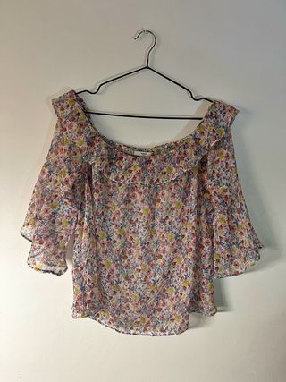 » Blusa floral con hombros descubiertos y manga 3/4. Tela muy fresquita. Transparenta un poco. En la última foto se puede ver como queda puesta. » Medidas: - Largo blusa: 47 cm. - Largo manga: 40 cm. » Puesta en una sola ocasión. Como nueva y en perfecto estado. → Precio no negociable. → Gastos de envío a cargo del comprador. ¡Te invito a entrar en mi perfil!☺️