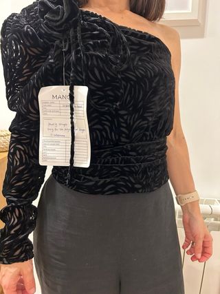 Blusa Mango hombro descubierto. Con etiqueta sin estrenar. Tejido tipo terciopelado negro, con detalles y una rosa que se puede quitar.