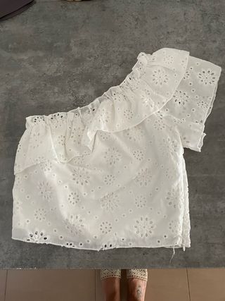 Bonita blusa negra con detalle de volantes y bordados. -NO ACEPTO BIZUM NI PAGOS POR WALLAPOP SOLO EFECTIVO ENTREGA EN PERSONA GRACIAS - Diseño de hombros descubiertos. - Volante con bordado inglés en el escote. - Tejido suave y ligero.