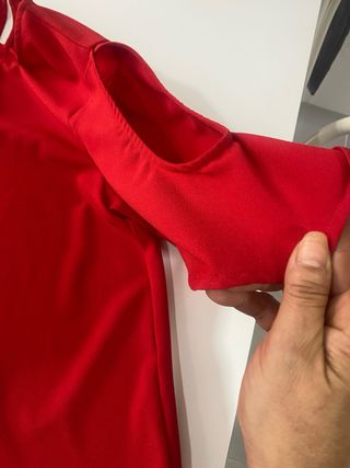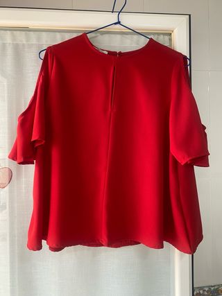 Preciosa blusa de color rojo. Es de manga corta y tiene los hombros descubiertos. La tela es suave y tiene un corte favorecedor. - Es una prenda elegante y versátil, ideal para cualquier ocasión. - Perfecta para usar en primavera u otoño. - Está en muy buen estado.