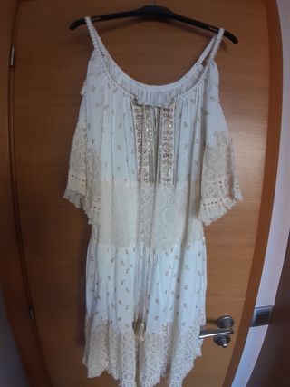 REBAJADO!!! Bello vestido corto o blusa amplia con hombros descubiertos y mangas anchas, NUEVO (con etiqueta). ▪︎ Destaca su hermoso diseño combinado con encaje. ▪︎ Tiene tela estampado con pequeñas flores doradas y delicado encaje ancho con terminaciones en flecos. ▪︎ Escote decorativo con cordón dorado. ▪︎ Forro interno. ▪︎ Tela 70% algodón y 30% poliamida. Sirve para talla L, XL, XXL. IMPORTANTE ver medidas: Largo: 85 cm. De axila a axila: 50 cm. Ancho de manga: 23 cm. Envíos: Sí. Entregas: Metro Sagrada Familia. Visita mi PERFIL. SÍGUEME :)