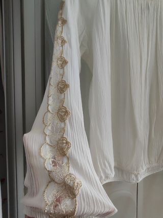 Blusa con elástico, para hombros descubiertos color blanco con encaje dorado en las mangas. Talla L/XL. Con gomillas. Tengo muchas cosas mira mi perfil, urge venta. Hago envíos.