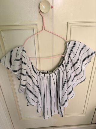 Top de rayas con los hombros descubiertos. Talla M, Stradivarius. 86% viscosa, 14% algodón