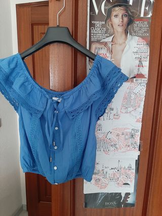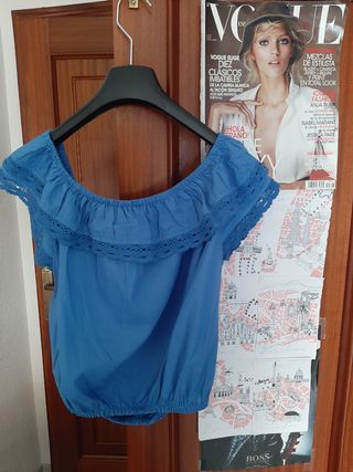 Blusa azul de Springfield con hombros descubiertos. Talla M - 38. No he llegado a estrenarla.